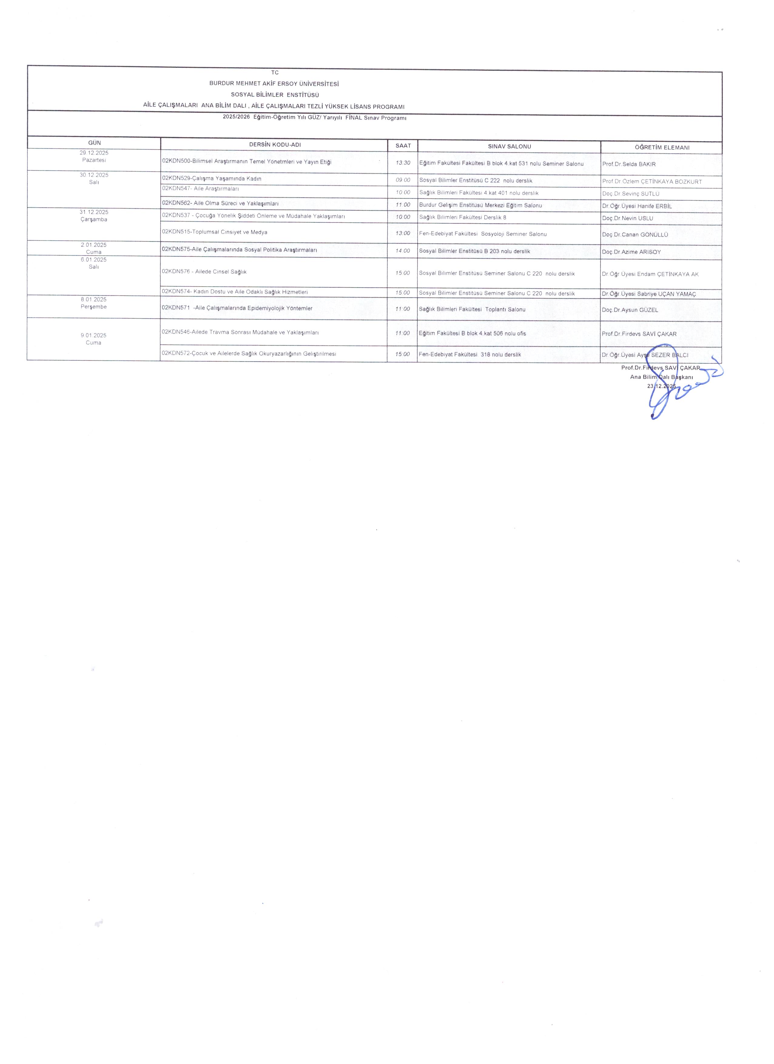 2025-2026 Eğitim Öğretim Yılı Güz Yarıyılı Yarıyıl Sonu (Final) Sınav Programları