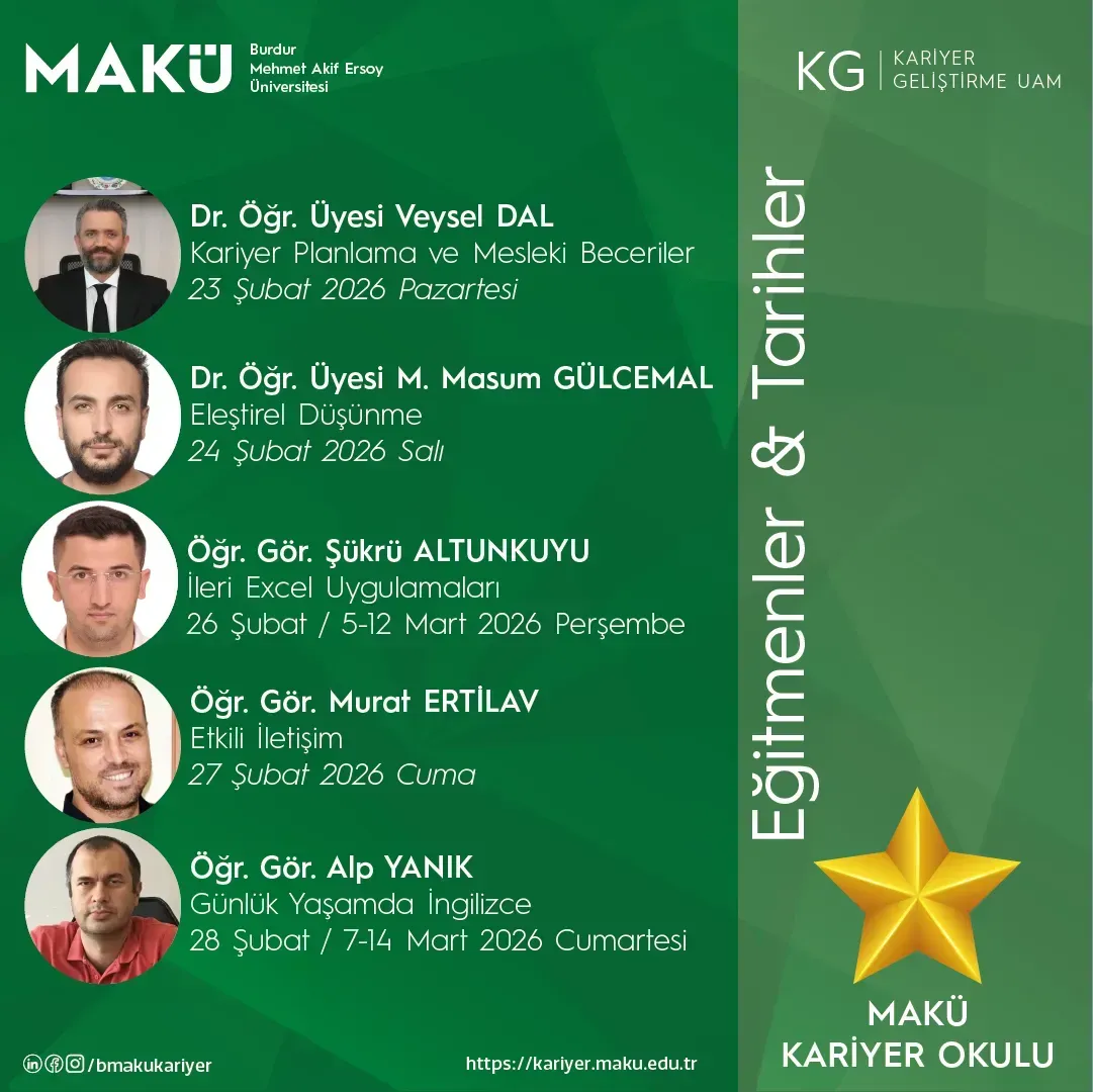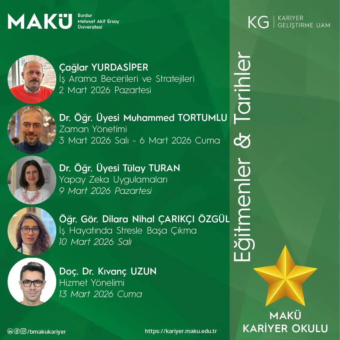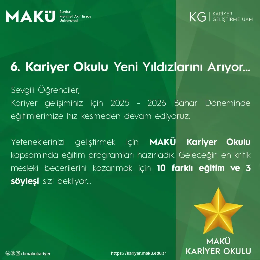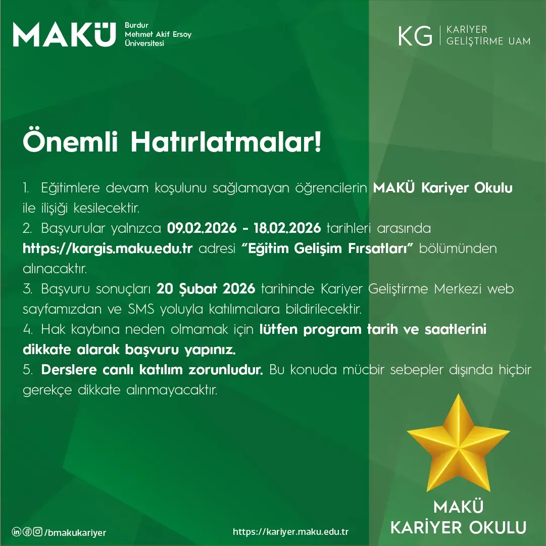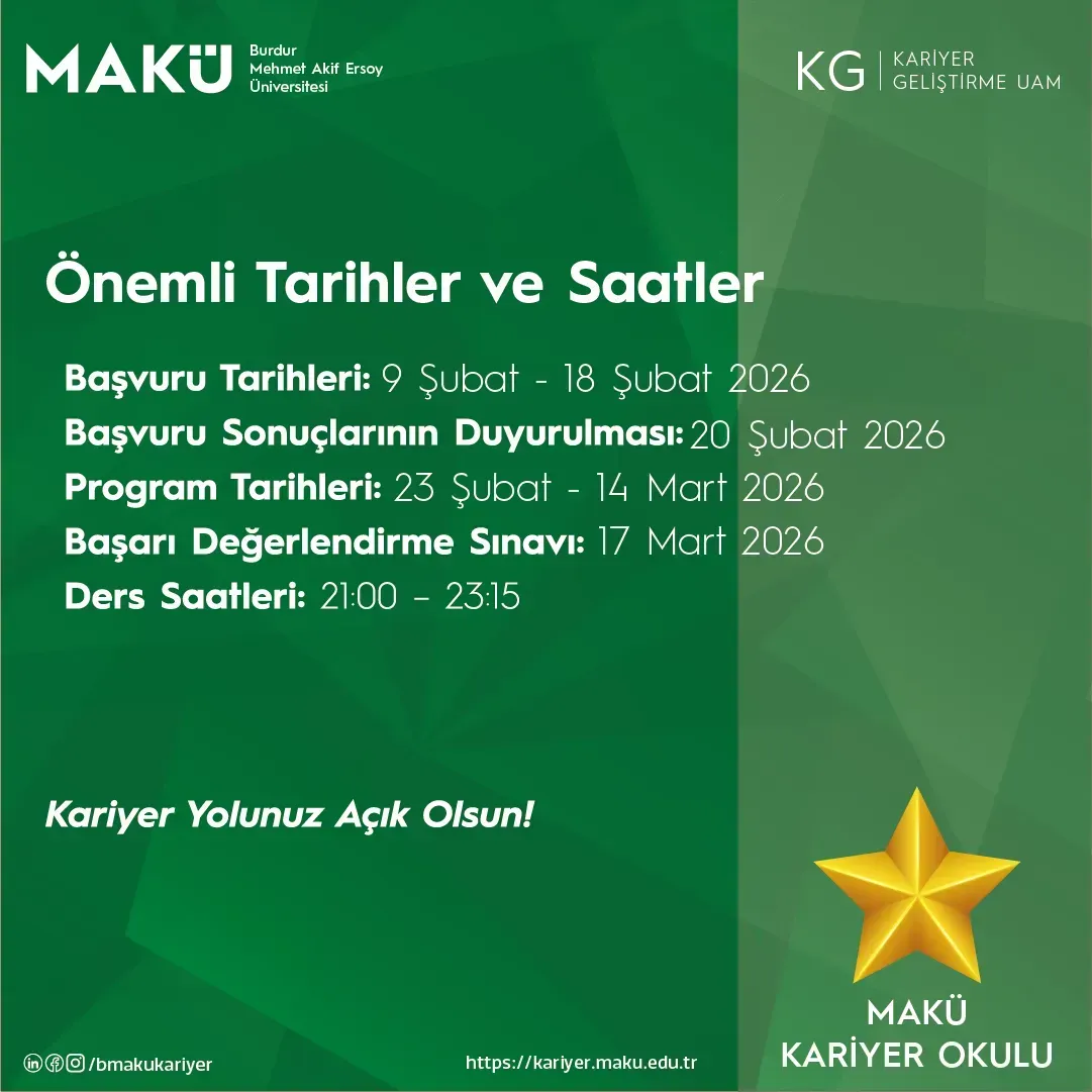 Yeteneklerinizi geliştirmek, kariyer hedeflerinize emin adımlarla ilerlemek ve geleceğin en kritik mesleki becerilerini kazanmak için MAKÜ Kariyer Okulu (ÇEVRİMİÇİ) kapsamında yeni eğitim programlarımızla sizleri bekliyoruz!