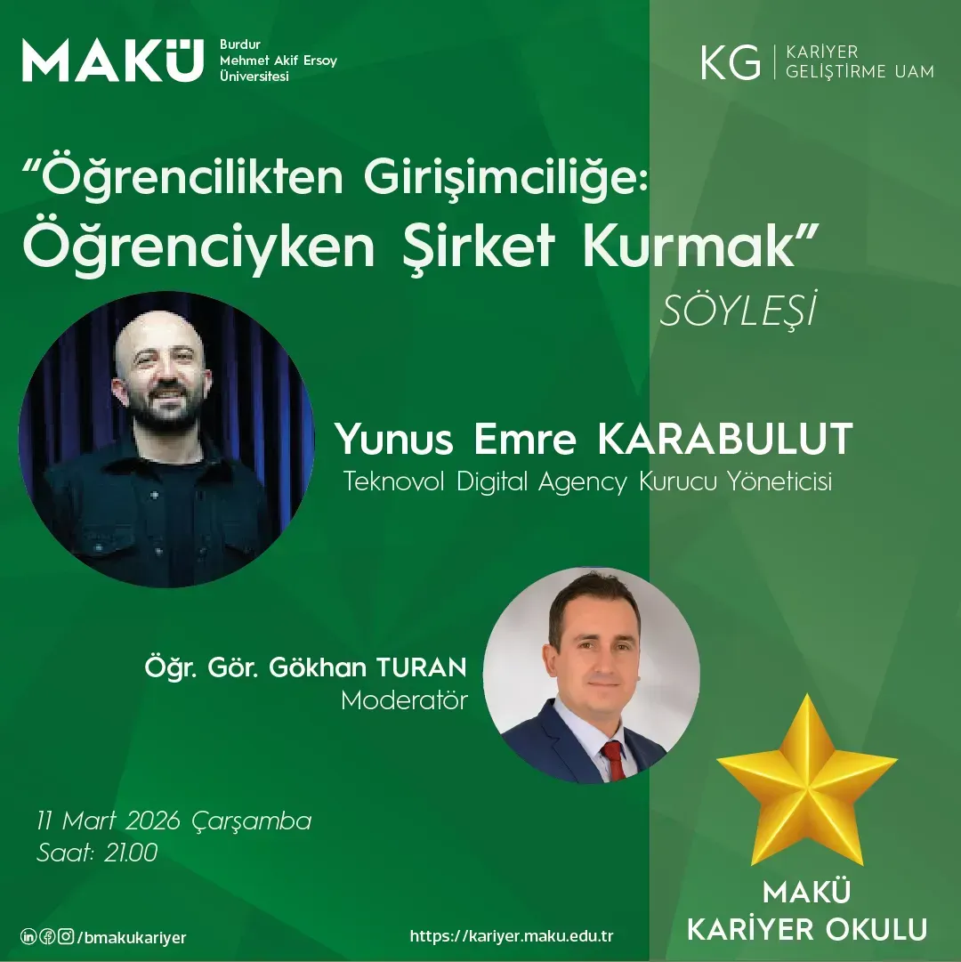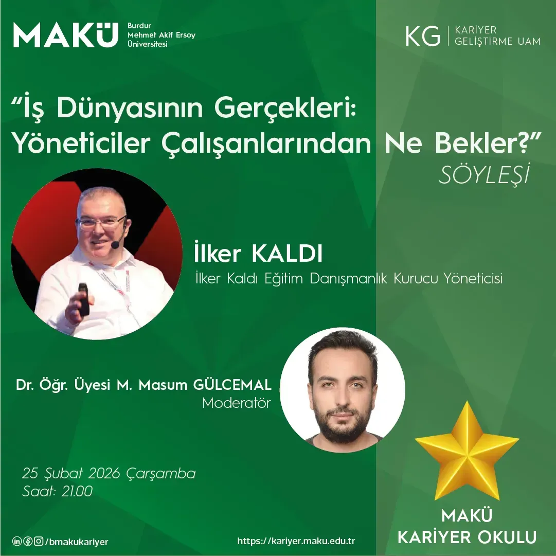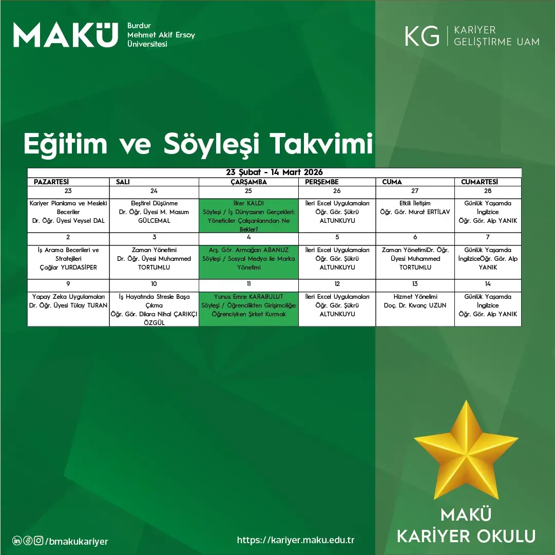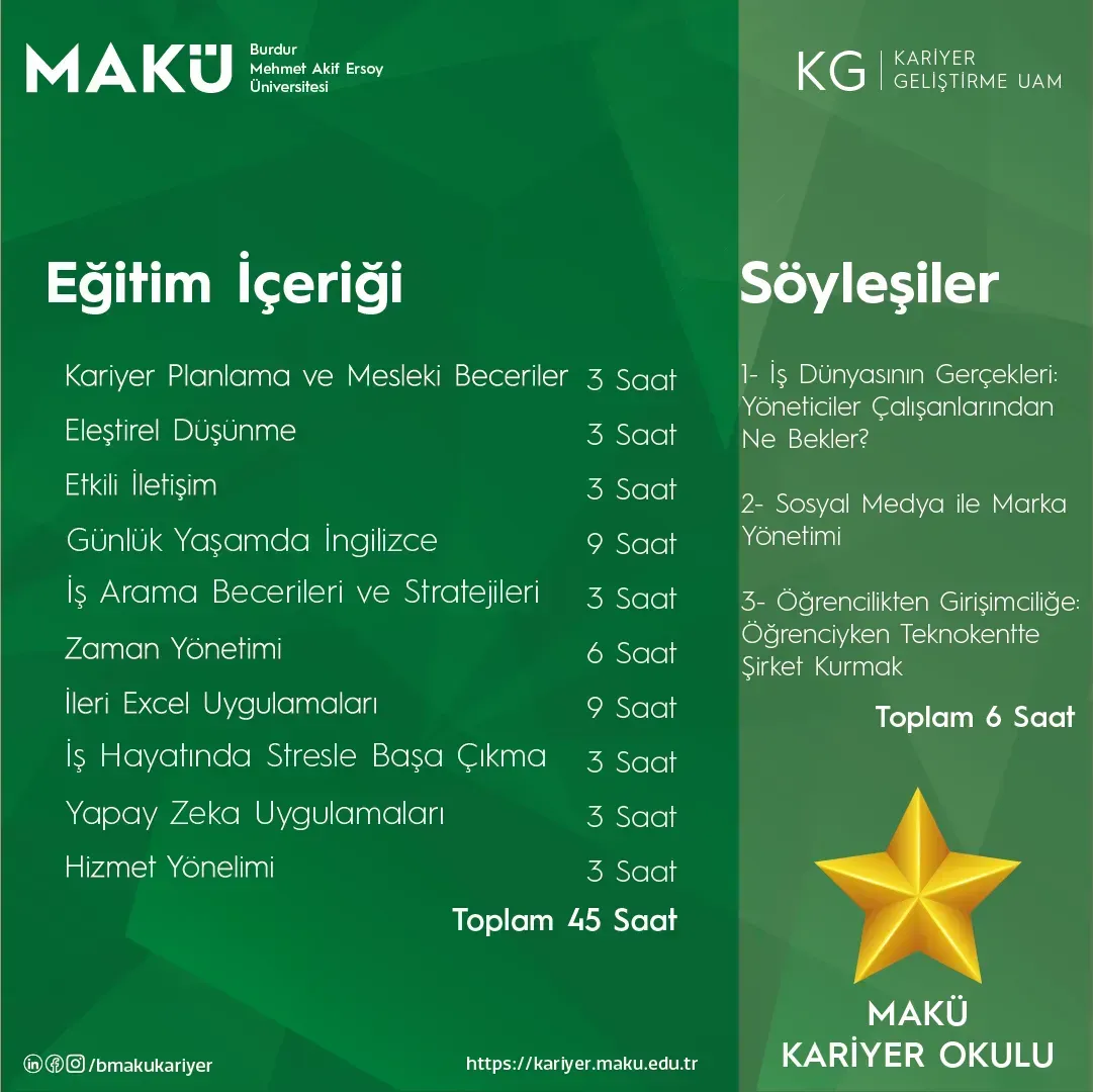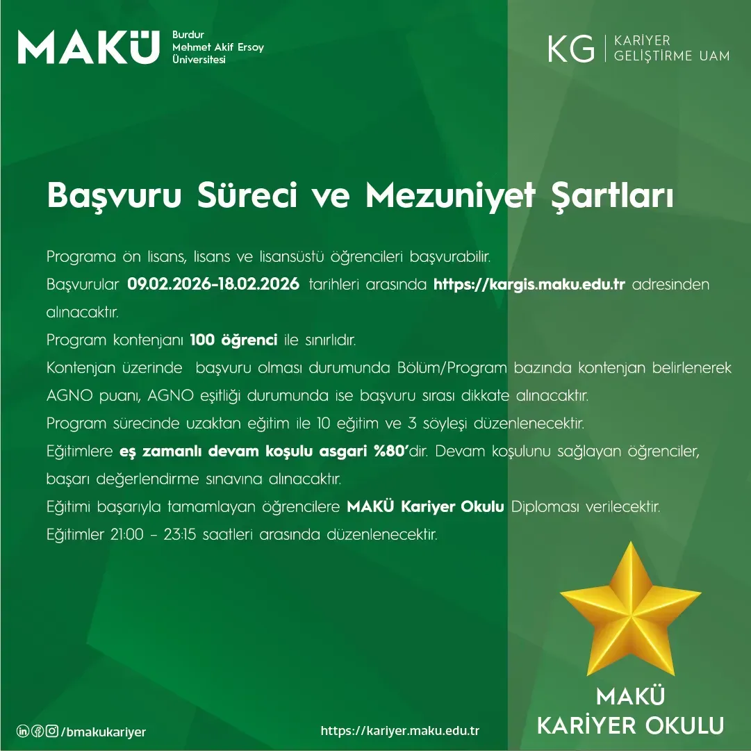 Yeteneklerinizi geliştirmek, kariyer hedeflerinize emin adımlarla ilerlemek ve geleceğin en kritik mesleki becerilerini kazanmak için MAKÜ Kariyer Okulu (ÇEVRİMİÇİ) kapsamında yeni eğitim programlarımızla sizleri bekliyoruz!